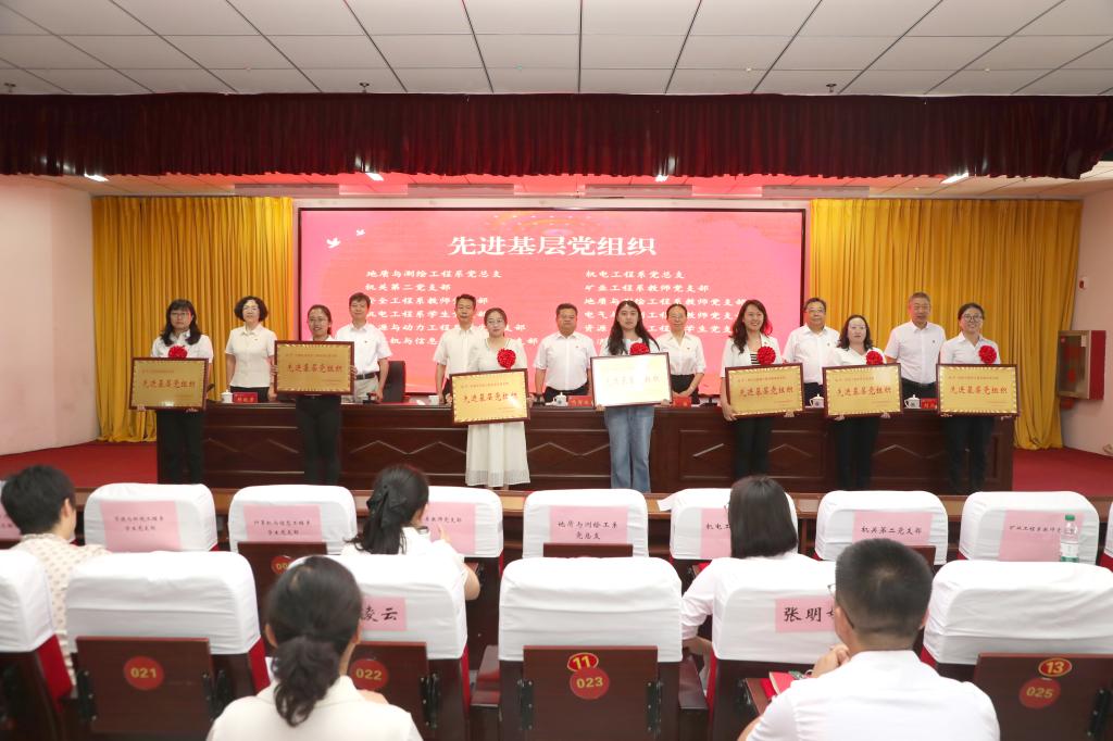 大会在庄严的国歌声中拉开序幕,党委副书记曲晋山宣读了《关于表彰优秀共产党员、优秀党务工作者和先进基层党组织的决定》,党委委员、纪委书记、监察专员张志力宣读了2025年“光荣在党50年”纪念章获得者名单。校领导分别为“优秀共产党员”“优秀党务工作者”和“先进基层党组织”代表颁奖,党委书记冯国瑞为“光荣在党50年”纪念章获得者颁发了纪念章。冯国瑞在讲话中代表校党委向受表彰的先进集体和优秀个人表示热烈的祝贺,向全校广大党员致以节日的问候和崇高的敬意。他指出,中国共产党成立104周年以来,风雨兼程,壮歌以行,新民主主义革命时期,开天辟地,完成救国大业;社会主义革命和建设时期,改天换地,完成兴国大业;改革开放和社会主义现代化建设新时期,翻天覆地,推进富国大业;从党的十八大召开至今的中国特色社会主义新时代,惊天动地,实现强国大业。惟其艰巨,所以伟大;惟其艰巨,更显荣光。